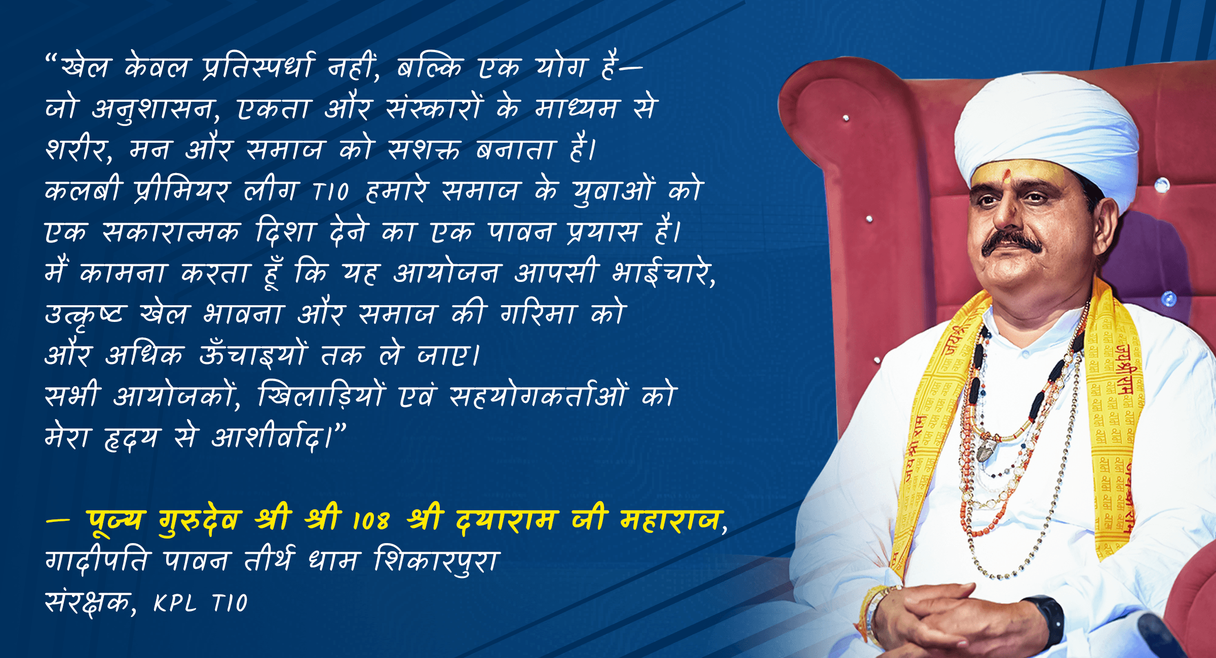 рдХрд▓рдмреА рд╕рдорд╛рдЬ рдХрд╛ рдЧрд░реНрд╡ рд╣реИ рдХрд┐ рд╣рдо рдЖрдпреЛрдЬрд┐рдд рд╣реЛрдиреЗ рд╡рд╛рд▓реЗ рдХрд▓рдмреА рдХреНрд░рд┐рдХреЗрдЯ рдкреНрд░реАрдорд┐рдпрд░ рд▓реАрдЧ 2025 (T10KPL) рдХреЗ рд╕рд╛рде рдЖрдкрдХреЗ рд╕рд╛рдордиреЗ рд╣реИрдВред рдЗрд╕ рдпрд╛рддреНрд░рд╛ рдореЗрдВ рд╣рдо рдЦреЗрд▓ рдХреА рдКрд░реНрдЬрд╛, рд╕рд╛рдЭреЗрджрд╛рд░реА, рдФрд░ рдЙрддреНрд╕рд╛рд╣ рдХреЗ рд╕рд╛рде рд╕рдореГрджреНрдзрд┐ рдХреА рдУрд░ рдмрдврд╝рддреЗ рд╣реИрдВред